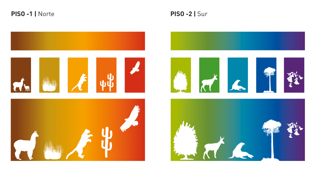 Respecto a los dos niveles subterráneos de estacionamientos -que resultaban complejos por poseer subdivisiones que hacían difícil la comprensión total del espacio- propusimos darle más color a los núcleos de acceso para destacarlos. Cada nivel evoca un sector de nuestro país; norte y sur, los que presentan un degradado en tonos cálidos o fríos con elementos de cada entorno.