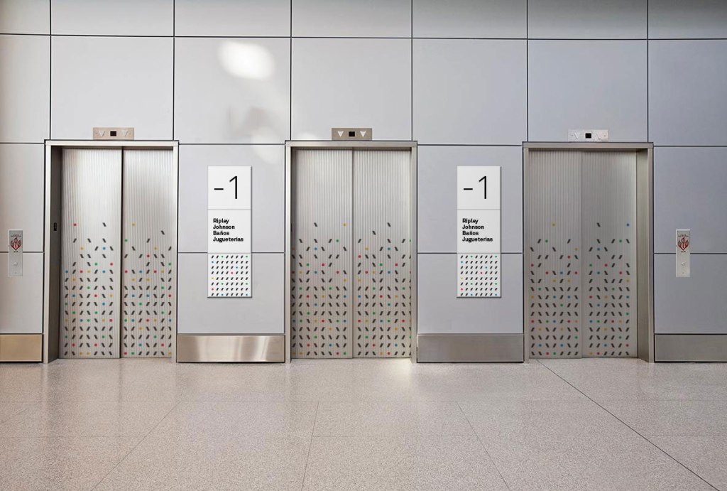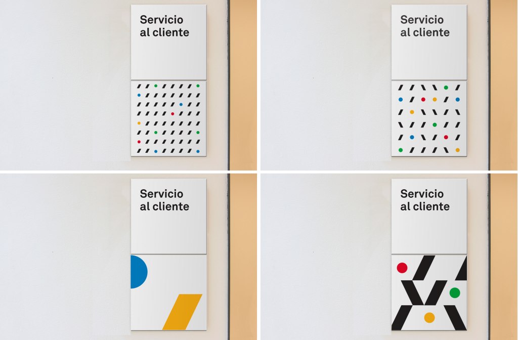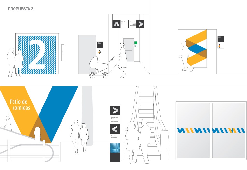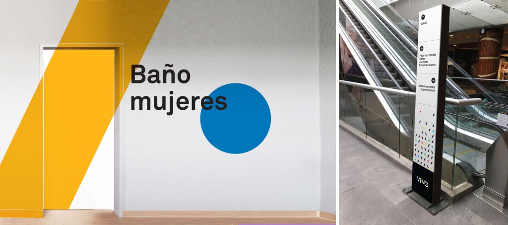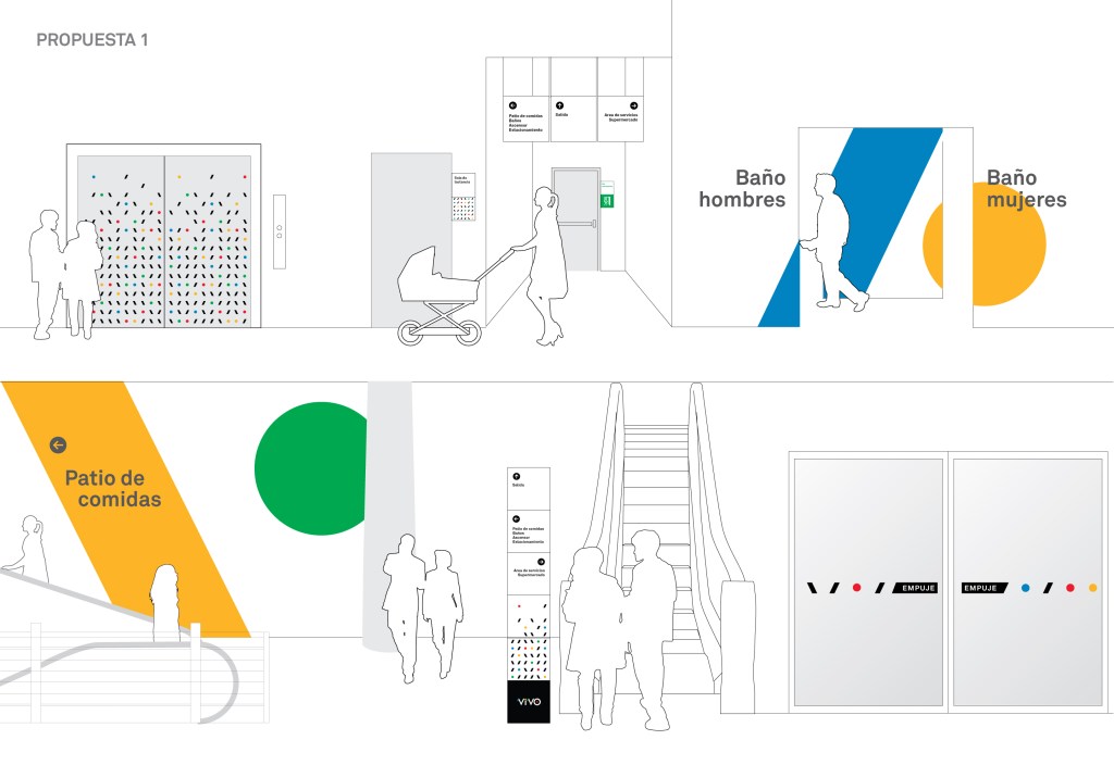 Desarrollamos dos propuestas para homologar el sistema de señalización de malls y Outlets Vivocorp, donde utilizamos los recursos gráficos de la marca (paleta de colores y figuras geométricas) aplicados de diversas maneras. La primera propuesta es un poco más sobria y trabaja con distintas densidades de patrones, y la segunda es más abstracta y osada, a la que sumamos el uso de pictogramas geométricos.