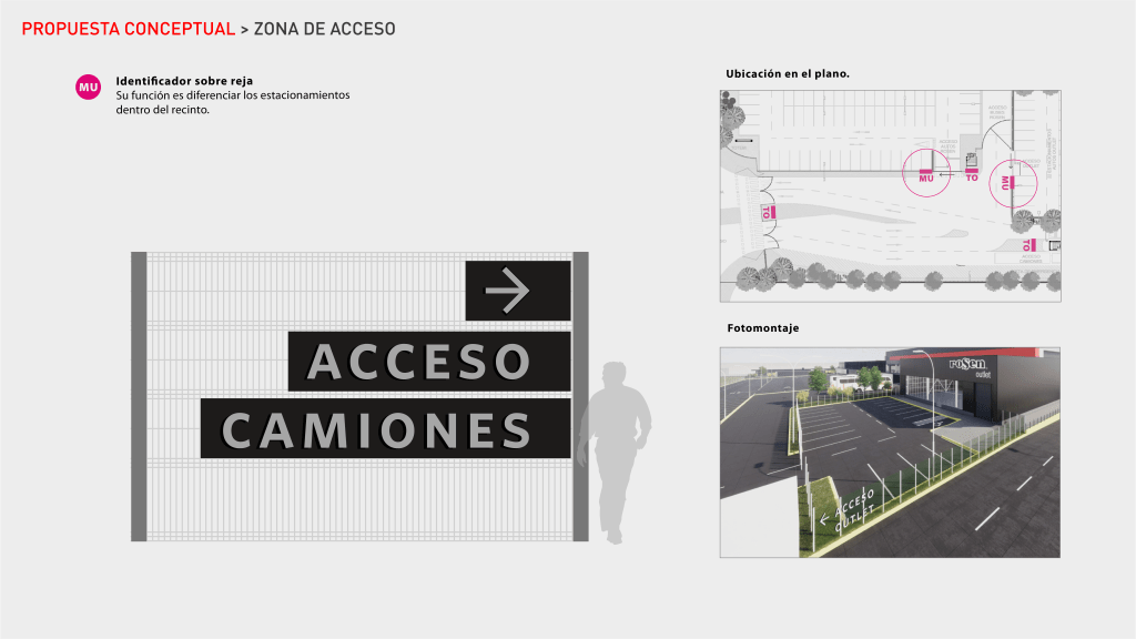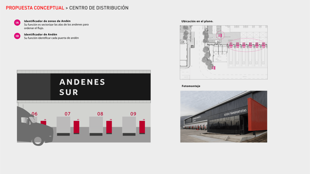 Diseñamos señales en distintas escalas con el objetivo de facilitar el recorrido y la experiencia de movilización y distribución dentro de este lugar, dando como resultado un sistema de señalización atractivo que se integra a la infraestructura presente, siendo fácil de comprender y seguir, el cual apoya de manera eficaz la compleja operación logística y corporativa que ocurre allí cada día.