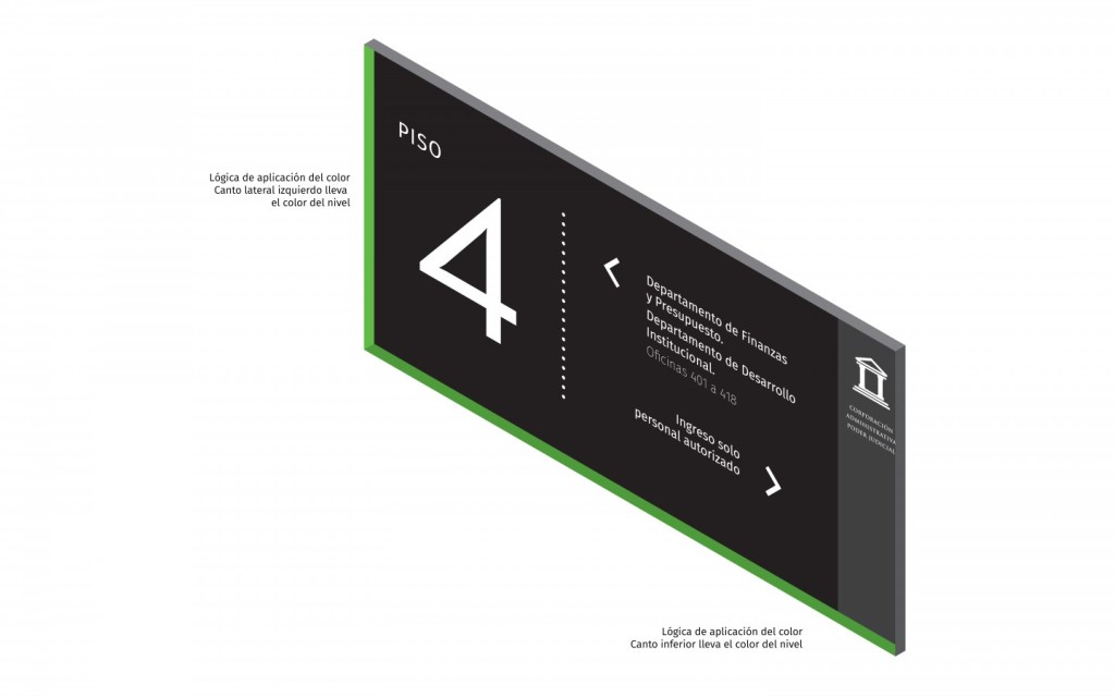 La Corporación Administrativa del Poder Judicial trasladó sus oficinas a un nuevo edificio en General Mackenna, Santiago, y con el objetivo de satisfacer las necesidades comunicativas de la organización y otorgarle una identidad distintiva a este nuevo espacio, se ideó un sistema de señalización que también se implementará en los Juzgados de Familia.