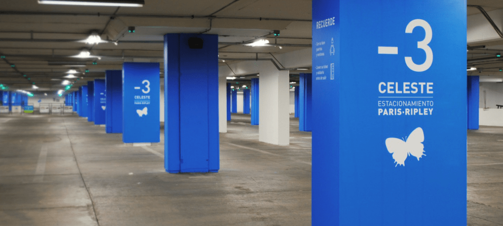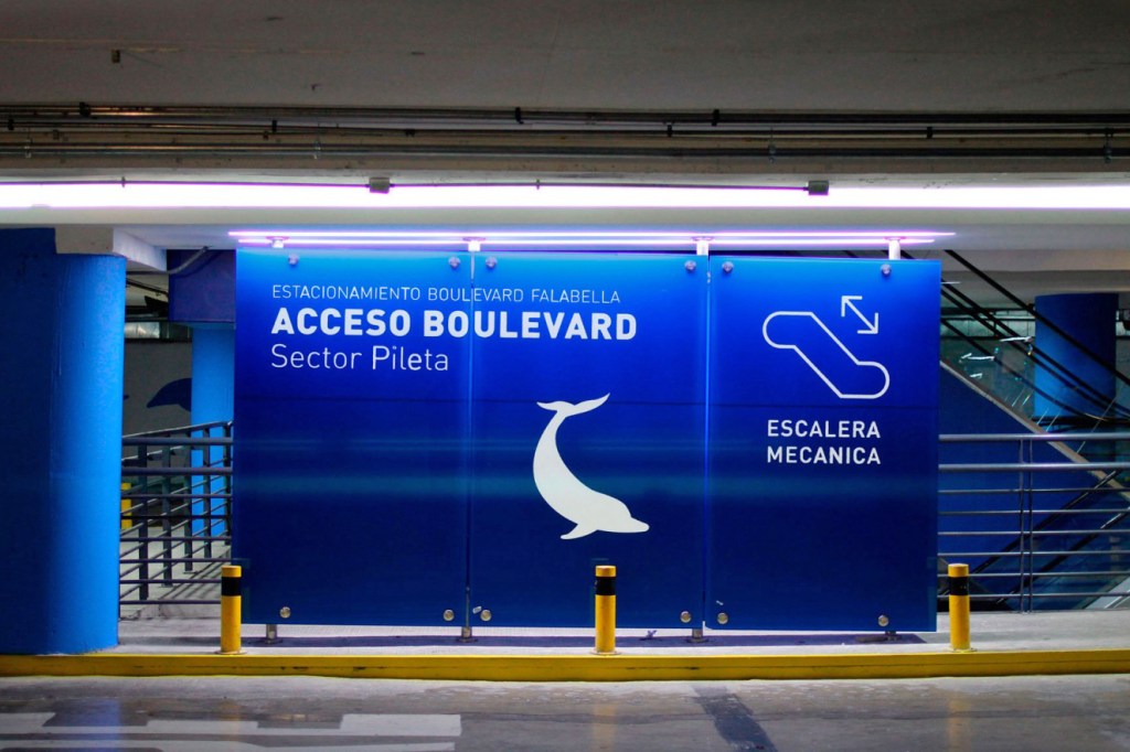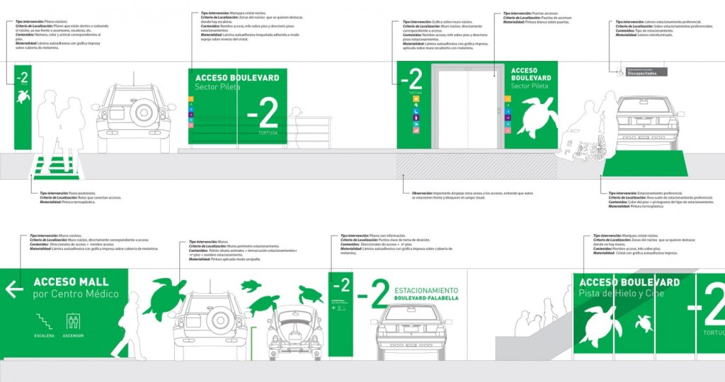 La propuesta de Wayfinding consistió en separar las dos principales áreas del mall y re-codificar cada uno de los pisos, asociándolos a un color único y reforzando este color con la ilustración de un animal. Además se incorporaron franjas de circulación para peatones y señales direccionales que guían a los usuarios a los distintos accesos al mall, de forma de facilitar la navegación. Tras la implementación del rediseño, los estacionamientos han sido evaluados positivamente por parte de los usuarios.