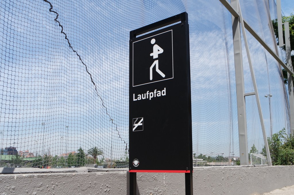 El resultado es un sistema de señalética coherente, legible y contemporáneo. La propuesta gráfica se inspira en los pictogramas diseñados por Otl Aicher para los Juegos Olímpicos de Múnich 1972. Esta referencia establece un vínculo directo con el espíritu deportivo del club y con sus raíces culturales, integrando un lenguaje visual claro, universal y funcional. Incorporamos los colores corporativos del club, negro y blanco, complementados con acentos en rojo que se expresan como franjas en las piezas de señalización, reforzando la identidad institucional y aportando una jerarquía visual clara.